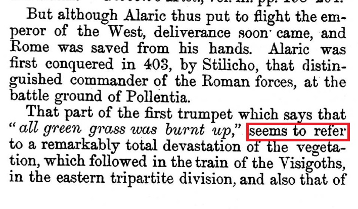 First trumpet - refers to the fall of Roman Empire which is the past but if you read the 7 trumpets, it aligns perfectly with the 7 last plagues. The hail and fire mingled with blood is being referred to the terrible effects of the Gothic invasion. But Scripture says the hail, fire mingled with blood are the means which those who receive the mark of the beast will get their noisome and grievous sore. Try to imagine chunks of ice and fire hitting your skin, this is just a tiny picture of what is really going to happen when the 1st plague is poured out. What makes it worse is that the writer, Mr Keith is not even sure of what he is saying thereby using the term "seems to refer". Another proof that the writer is not sure is that he used the phrase "may refer", again, another way of saying he is not really sure. To close the door shut, what these learned men and really saying is just their "commentary". They are not saying thus saith the Lord or inspired of the Holy Spirit. In short, they are speaking of their own words and not of God.