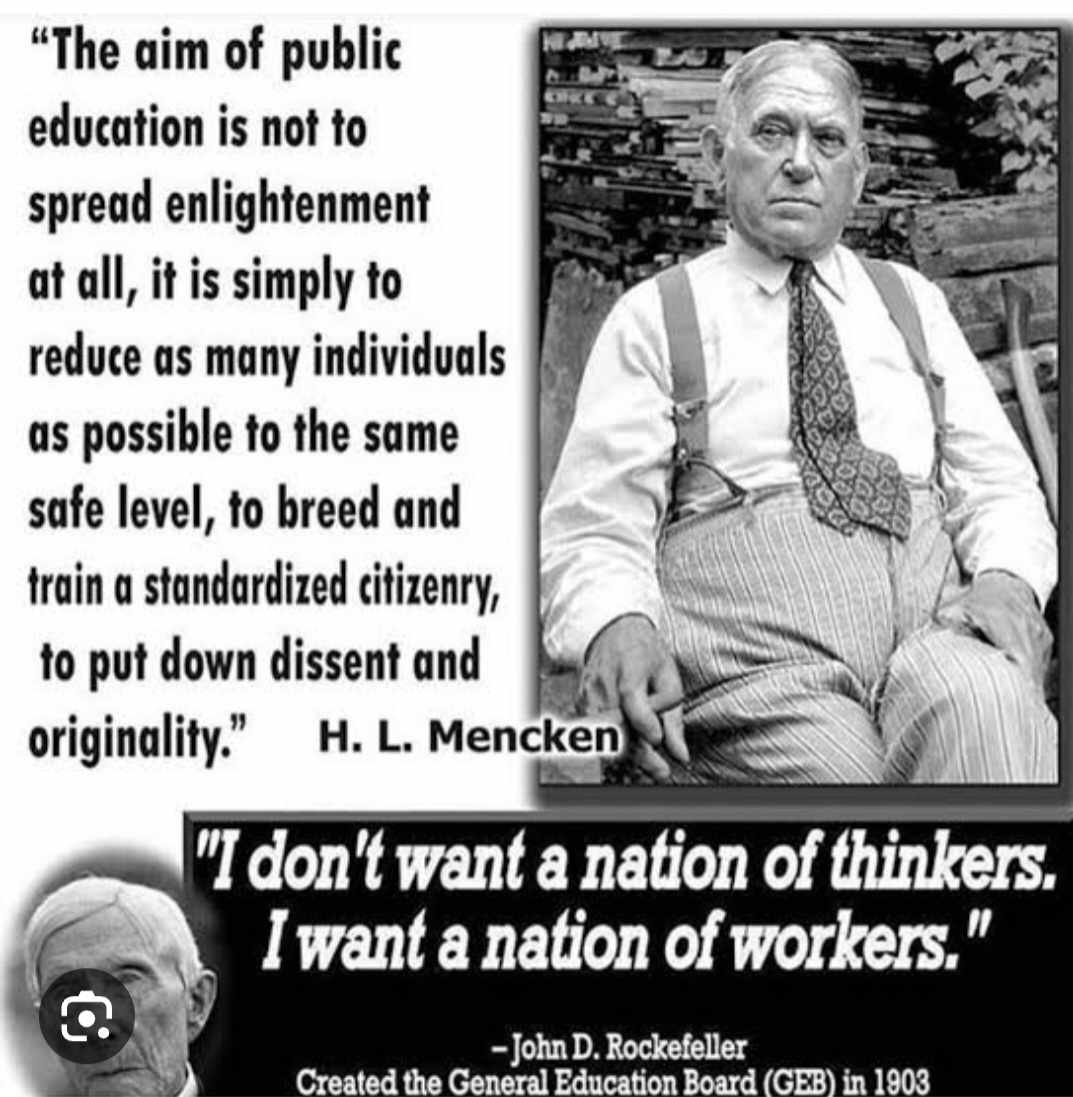 History of the Board of Education (USA) The world believes that the regular school is the environment to make us learn something good but the reality is the opposite. It is not an environment to stimulate learning because it actually prevents the little children to develop their innate curiousity and their eagerness to learn. MINDLESS CONFORMITY is one of the best tools that the regular school is using to where the little children's mind are programmed to conform without thinking or investigating. Their minds are molded to go to a direction where all they have to do is follow what they hear and treat it as truthful no matter how false it is. This is one of Satan's methods that he used in the rebellion against the government of God. One-third of the angels were not able to use their minds to realize how lofty and blessed their position was being in the heavenly courts as part of the heavenly family. They did not use their minds to think how just and how glorified the government of God was. They automatically were convinced by whom they constantly listened to. The end result was their fall and being kicked out of the heavenly courts. This is the same method that the regular school is doing to the little children so that when they grow old, they will naturally conform without thinking or investigating. We can also see in the regular school that the individual uniqueness of each child is being ignored by introducing to them standardized lessons and examinations. These lessons and exams are then used as a determining factor for the level of their intelligence. Those who do good in these tests are then labeled as intelligent while those who donot do well are being looked upon as less intelligent. This mass education is actually not for a better future for each child but for the better future of the industrial world. This was the original plan for the institution of the common or regular school. Let us look at some facts regarding the history of the Board of Education. It was during the rise of the industries where we can see how this department started. It is all well planned that the visions and goals of the rich shall be attained. We can see how a merchandise is produced by the regular school system: In the school system, we can see how the hierarchy of the industrial bureaucracy is reflected clearly. The little children are under the hierarchy of the school leadership and all they have to do is surrender and follow everything that the leadership presents to them. From those who are not even professed Christians, we can see how they have presented to us the original designs and plans for these regular schools where little children are sent. "Built on the factory model, mass education taught basic reading, writing and arithmetic, a bit of history and other subjects — the overt curriculum. Beneath it was the covert curriculum that was far more basic. It consisted of three courses — punctuality, obedience and repetitive work — the basic training requirements to produce reliable, productive factory workers. Factory labour demanded workers who would take orders from a management hierarchy without questioning. And it demanded men and women prepared to slave away at machines or in offices performing brutally repetitive jobs. " (paraphrased from Alvin Toffler's Future Shock) We can see a few very important courses that little children must learn Let us meet the man behind the board of education. His name is John Rockefeller. One of the wealthiest and most powerful men in the US history who spent nearly $130m for schools. He said himself that "I dont want a nation of thinkers, I want a nation of workers." From here, we can clearly conclude that the regular school is designed to make little children workers in the future without the power of being thinkers. While God's design for man is for us to use our God-given power of the mind where we have to think and analyze things. While John Rockefeller instituted something that went contrary to the plans and purposes of God especially for the little kids whose minds are fast developing. Instead of them cultivating and enhancing their natural ability to learn and think, they are sent to the prison to stifle their innate curiousity and eagerness to learn and to mindlessly conform to what's being taught to them. This bloodline of Rockefeller had some striking statements that would really open your eyes as to what this man is really about. “We are on the verge of a global transformation. All we need is the right major crisis and the nations will accept the New World Order.” Rockefeller, Sept 14, 1994 Back to the rise of the industries, the employers there saw that schooling was the best way to create better workers. This must start from the little children in order to make them better fit for the future life in the industries. The children's crucial lessons would be punctuality, following directions, tolerance for long hours of tedious work and a minimal ability to read and write. To them, the duller the lessons or subjects, the better. This statement from Psychology Today is really a reality of what's going on in the industrial world where we see the employees must be punctual, must follow standard operating procedures and must be tolerant to these long hours of tedious repetitive work and with minimal ability to read and write. This is the nature of life that the little children must prepare for their future. But with the changing society, we can see how the regular schools do not only produces factory workers but some of the students end up in different types of career not quiet similar to the nature of work in the factories or industries. Yet we can still see how their training as a young child are standardized. They follow the same curriculum thereby programming their mind to go to a specific direction opposite of what God's plans are. This is the process of inculcation in the school system: