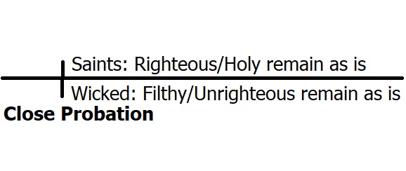Again, there are two classes of people being mentioned here; the unjust and the filthy, the just and the righteous. When this is pronounced, whatever condition one is found in will remain as they are. The unrighteous will have no more second chance for heaven. There case has been decided! And for the righteous, they will nevermore sin again for they are sealed and the power of God rests on them. They have overcome the world and followed the Lamb of God who has taken away their sins.